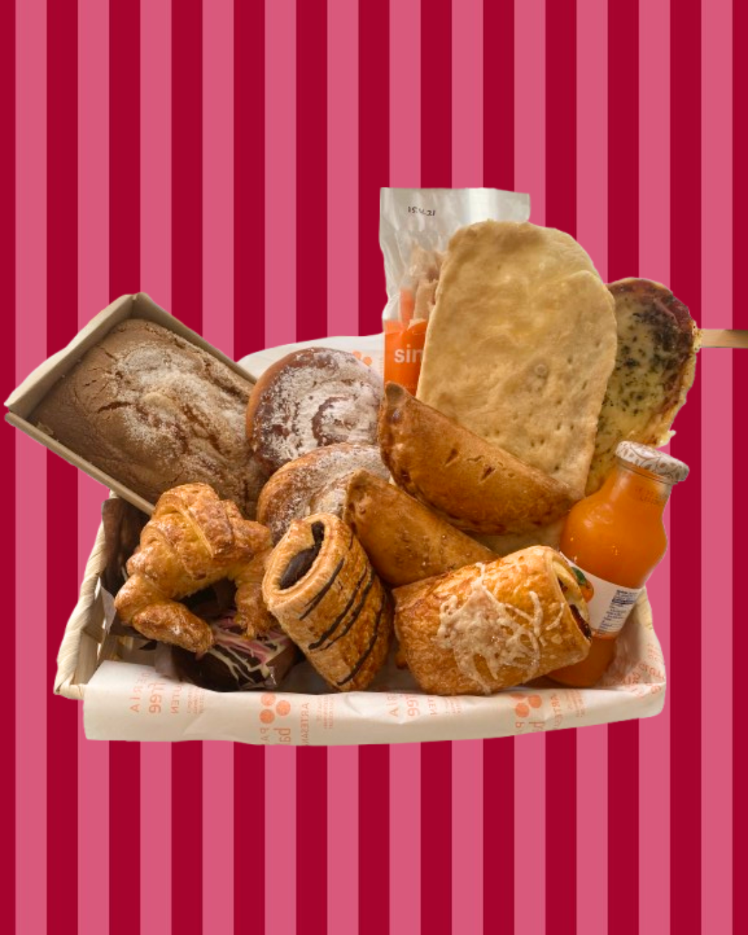 - Opción Mixta: 2 empanadillas, 1 croissant grande, 1 ensaimada, 1 napolitana chocolate, 1 napolitana salada, 1 batido, 1 zumo.
