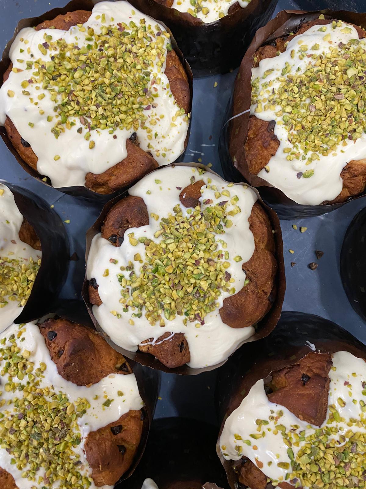 Panettone con pepitas de chocolate, relleno de crema de pistacho y cubierto de chocolate blanco y pistacho granulado.